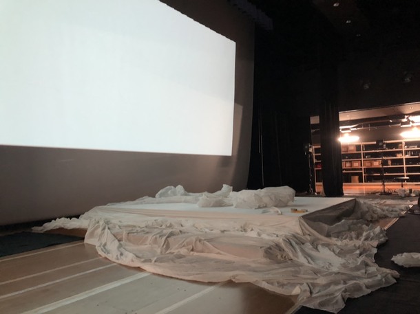 公演当日、朝一番に指揮・演出・舞台スタッフが会場入り。小道具・衣装等の搬入と、劇場スタッフの方々のお力を借りながら舞台の設営を行いました。《出雲阿国》の舞台世界は一面まっ白。舞台全体に白布を敷きます。大掛かりな舞台セットなどはなく、一見シンプルに見えますが、途中で布がずれたりキャストがつまづいたりしないように、一枚一枚しっかりと床面に貼り付けていく作業。さらに、客席から美しくみえるように調整を重ねます。その裏では照明、字幕の準備を行っていました。