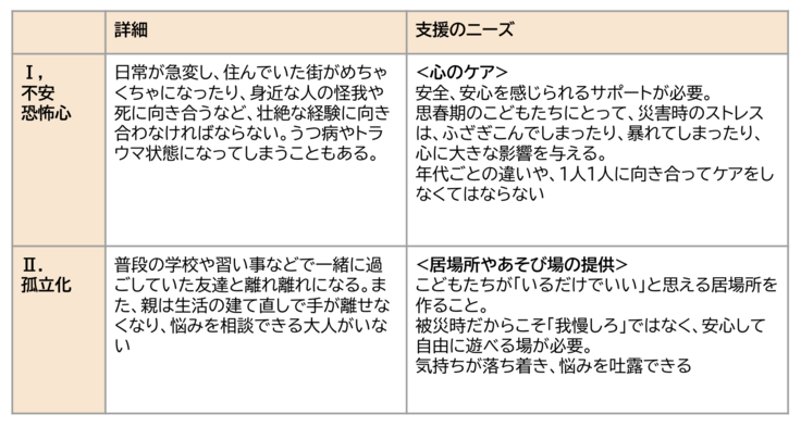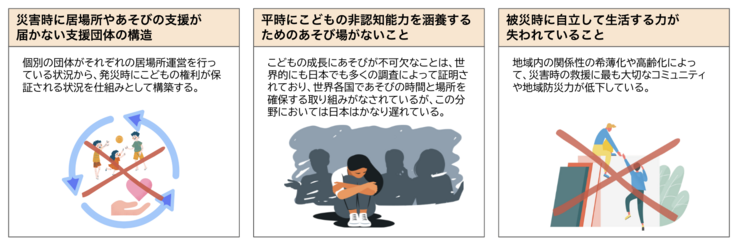 その際に、周囲の大人が適切なケアやサポートができないと心に深い傷を負ってしまう場合がある一方で、周囲の大人の多くもまた被災者であり、余裕がないことが多いため、専門家やこどもとの関わりを経験してきた人材による居場所やあそび場の展開が求められます。
