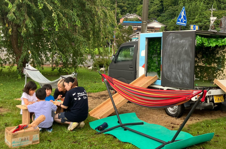 車に様々なあそび道具や素材を載せて、公園や仮設住宅、公民館などを移動しながら各地であそび場を開催する取り組みです。