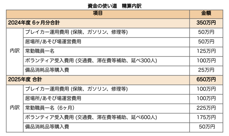 2024年度末までは基本的に毎日、居場所やあそび場を運営します(移動や休養などに必要な休みや年末年始などを除く) 2025年度は週末や学童等の居場所がない地域を中心にあそび場を運営すると共に、地元の居場所やあそび場を運営する団体の支援を行います。また、金沢の大学生が能登に滞在しながらボランティアができる仕組みを構築します。2024年度(6ヶ月分)…350万円 プレイカーの運用費用(保険、ガソリン、修理等諸経費)…50万円 居場所/あそび場の運営費用…50万円 常勤職員一名…125万円 ボランティア受入費用(交通費、滞在費等補助、延べ300人)…100万円 その他、備品消耗品等購入費…25万円 2025年度…650万円 プレイカーの運用費用(保険、ガソリン、修理等諸経費)…100万円 居場所/あそび場の運営費用…100万円 常勤職員一名(6ヶ月)…225万円 ボランティア受入費用(交通費、滞在費等補助、延べ600人)…175万円 その他、備品消耗品等購入費…50万円