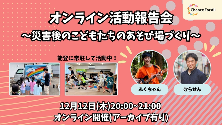 このたび、CFAが能登半島の被災地で取り組んでいる「あそび場づくり」の活動について、オンライン報告会を開催する運びとなりましたので、お知らせいたします。