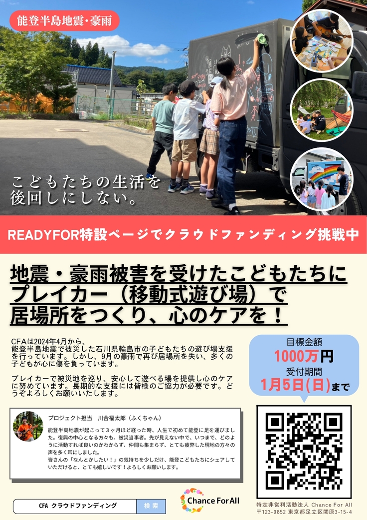 私たちは、こどもたちのあそびの大切さを多くの方に知ってもらい、そして継続的に能登のこどもたちの支援をできるようにクラウドファンディングで資金集めを行っています。