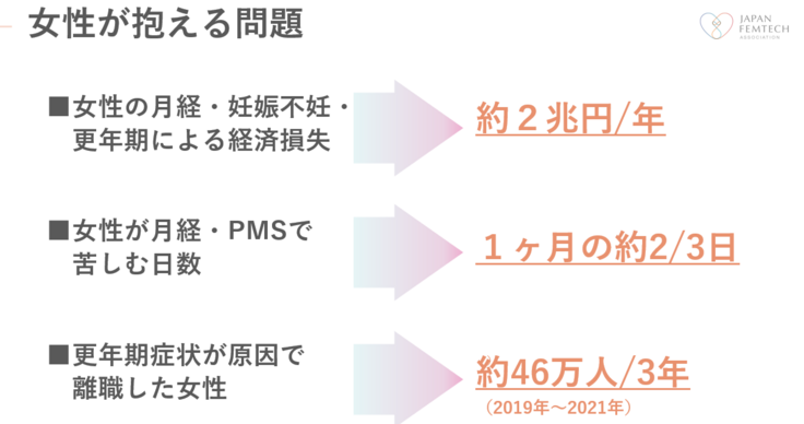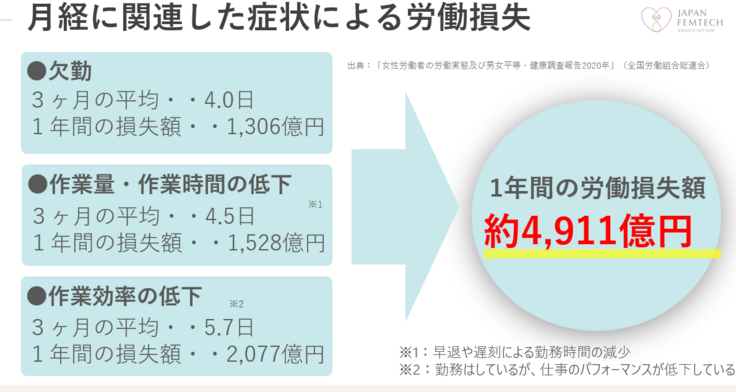 そうした、女性の健康課題による労働損失は、月経に関連するものだけでも4900億円以上になります。