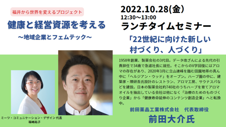 1958年創業、製薬会社の3代目。データ改ざんによる先代の引責辞任で34歳で急遽社長に就任。そこからのV字回復にはアロマの存在があり、2020年3月に立山連峰を臨む田園地帯の真ん中に「ヘルジアン・ウッド」をオープン。ハーブ園の中に、建築家・隈研吾氏設計のレストラン、アロマ工房、サウナスパなどを建設。日本の製薬会社約740社のうちハーブを育てアロマオイルを抽出している会社は他になく「治療のためのものづくり企業」から「健康寿命延伸のコンテンツ創造企業」へと転換中。