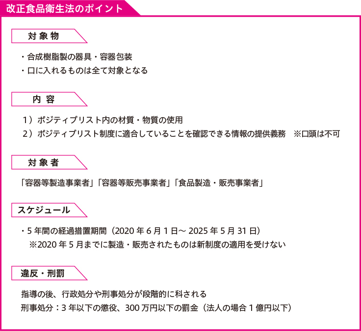 そういった側面から、今回の食品衛生法では、食品そのものだけでなく、食べ物が接する容器や道具類にも、厳しい基準が設けられたと考えられます。