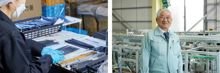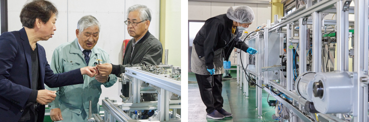 そこで頼ったのが、当社の工場がある宮城県石巻市で、製造機械などの設計・製造を行っている会社の社長、後藤春雄さんでした。後藤さんは現代の名工の称号を持つ大ベテランですが、箸を塗装する機械というのは初めてだったため、かなり苦戦したそうです。