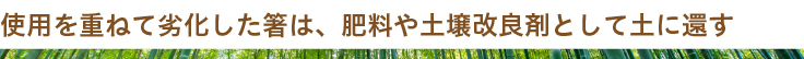 牡蠣の養殖が盛んな石巻では、海に浮かぶ木製の養殖いかだを処分する際、炭化させて土壌改良剤に生まれ変わらせています。役目を終えた竹染箸もそのサイクルに組み込んで、おいしい野菜を育む土へと還してまいります。