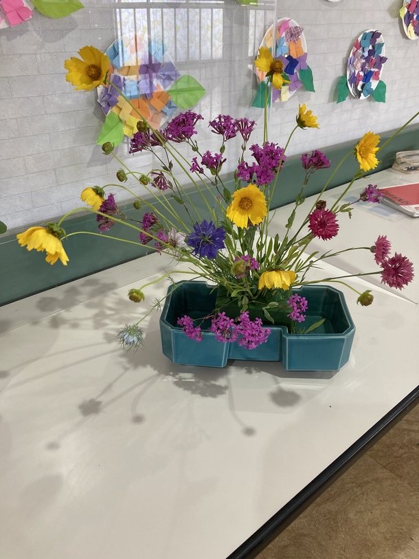 今日は、家の庭で咲いてる花を持ってきて、生け花して頂きました。
