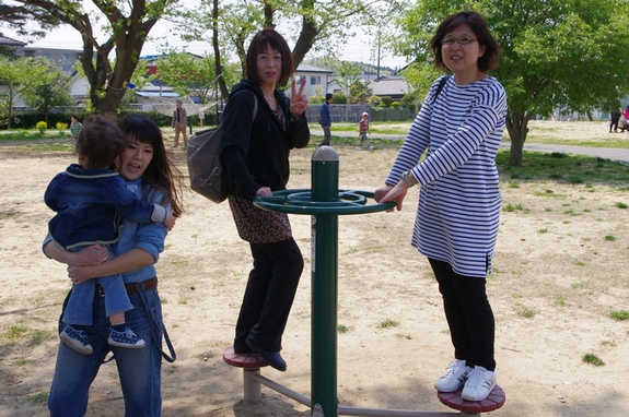 高見公園には、大人向けの健康作り遊具(ちょいトレシリーズ)もたくさんあるんです。しかも2~3人いっしょでできるものが多いんですよ。つまり、コミュニケーションを図りながら体力作りができるということなのです。写真はウエストを引き締める効果のある“くねくね”です。