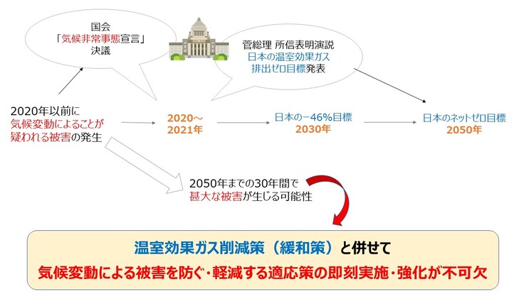 2050年までにも気候変動による甚大な被害が出る可能性があり、温室効果ガス削減対策(緩和策)のみならず、気候変動による被害を防ぐこと(適応策)は急務です。