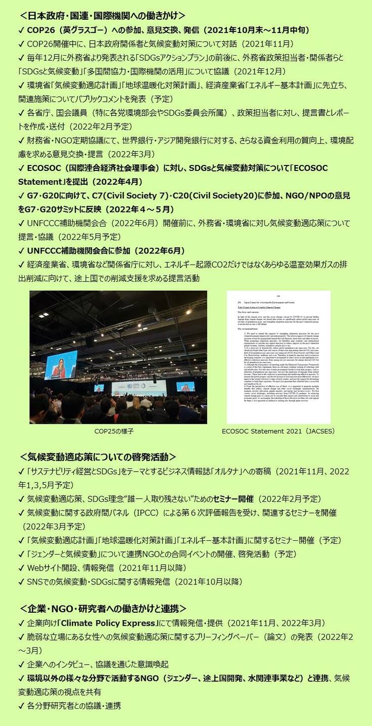 運営内容詳細:政策提言・アドボカシーを通して、日本政府・国際機関に対し、気候変動の被害を受けやすい脆弱な人々に対する支援(適応策)拡充と気候変動の原因となる温室効果ガス削減策(緩和策)拡充を求める