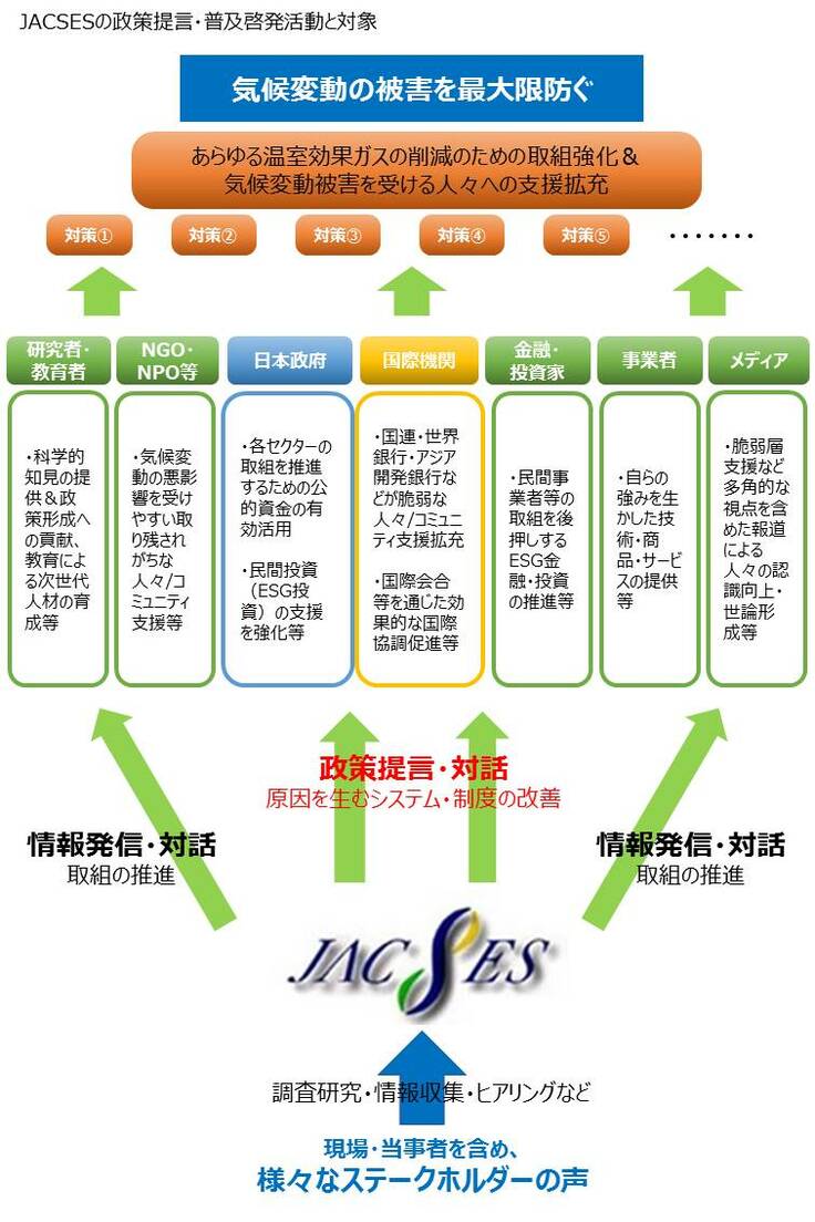 JACSESは、1993年に設立されてから約30年の活動を通じて、様々な制度・政策を実現してきました(気候変動プログラムの実績の一部は、下記を参照ください)。引き続き、社会で見過ごされがちだけれども重要な課題解決に向けて社会システム・制度を改善するため、『政策提言』という手段で政府や国際機関に働きかけ、気候変動対策を後押しします。