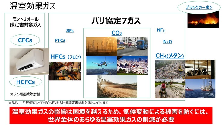 気候変動の要因となっている温室効果ガスには、パリ協定で規定されている7ガス(CO2〈化石燃料の燃焼だけでなく森林減少や土地利用変化等によっても排出〉・メタン〈廃棄物埋立・家畜の腸内発酵・稲作・化石燃料採掘等により排出〉・HFC〈エアコンや冷蔵庫等の冷媒・スプレー等で排出〉等)に加え、パリ協定には規定されていないが温室効果をもつCFC・HCFC〈いずれもエアコンや冷蔵庫等の冷媒等で排出〉やブラックカーボン〈ディーゼルエンジンの排気ガス・石炭燃焼・森林火災・薪などバイオマス燃料の燃焼等で排出〉等もあり、気候変動による被害を防ぐには、これら全ての削減を進める必要があります。