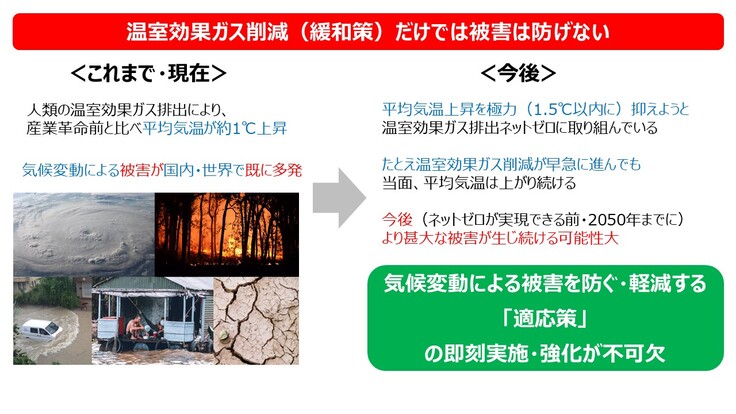 世界的に温室効果ガス削減の取組が拡大しているのは、これまでにも気候変動に起因する被害・悪影響が拡大しているからです。日本・世界の温室効果ガスネットゼロおよび1.5℃目標がたとえ2050年に達成できたとしても、現在生じている・将来発生すると予測される気候変動による悪影響・被害を回避・軽減する適応策が必要です(※4)。