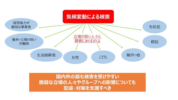 気候変動による悪影響を受けやすい脆弱な立場の人々・グループとは、貧困に苦しむ女性や子供、移民、先住民、生活困窮者、障がい者、個人の権利・立場の弱い労働者、経営体力が脆弱な事業者等が想定されます。コロナ禍において、失業・貧困が拡大し、気候変動による被害を受けやすい人々が増加していることが大いに懸念されます。
