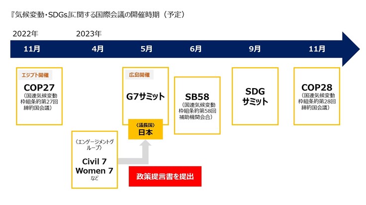 2022年から2023年にかけ、国連気候変動枠組条約第27回締約国会議(COP27)やG7サミット、SDGサミットといった重要な国際会議が開催されます。