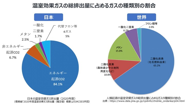日本政府は、2050年の温室効果ガスネットゼロ(カーボンニュートラル)を掲げていますが、これは、日本の温室効果ガス排出の80%以上を占めるエネルギー起源CO2(化石燃料由来の二酸化炭素)をネットゼロにするだけではなく、メタン・フロン類などを含め日本の温室効果ガスをトータルでネットゼロにするということです。