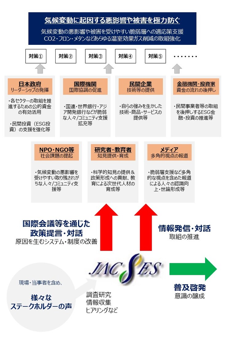 JACSESは、これまでの活動を通して得た情報やネットワーク、保有する国連経済社会理事会(ECOSOC)協議資格や国連気候変動枠組条約(UNFCCC)へのオブザーバー参加資格を活かし、国際会議の議論・交渉や世界の取組をフォロー・日本に伝えつつ、関連省庁、企業、NGO等と対話を続け、政策提言、ネットワーク構築、日本の状況や取組を世界に発信していくという活動を行ってきました。