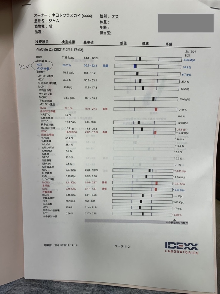 血液検査は前回数値がかなり低かったPCVが上がったものの、未だ基準値にはならず。
