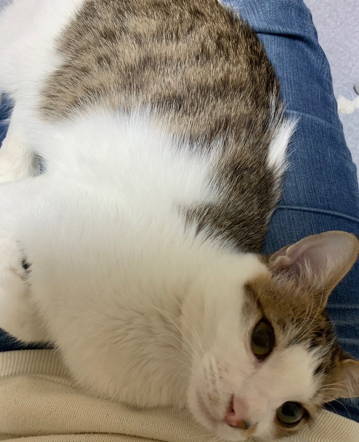 スタッフのお膝にのって、べったりと甘えるジャムくん。