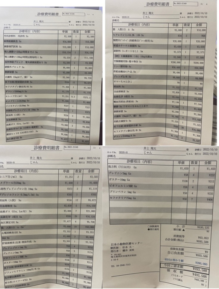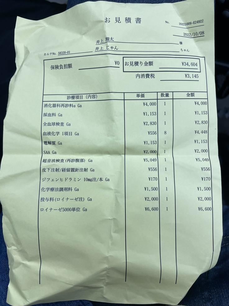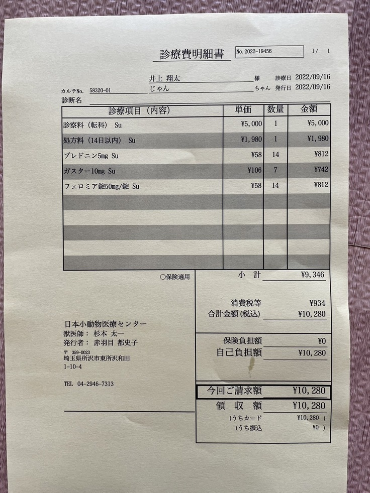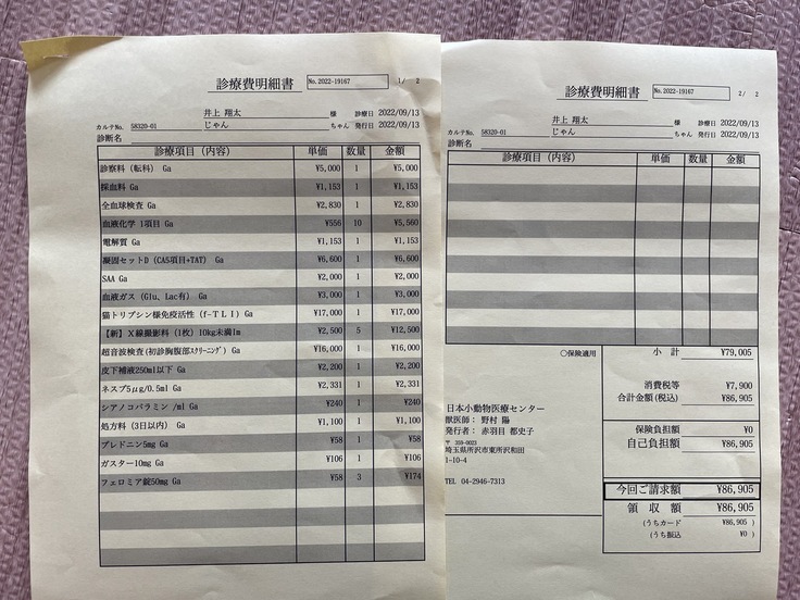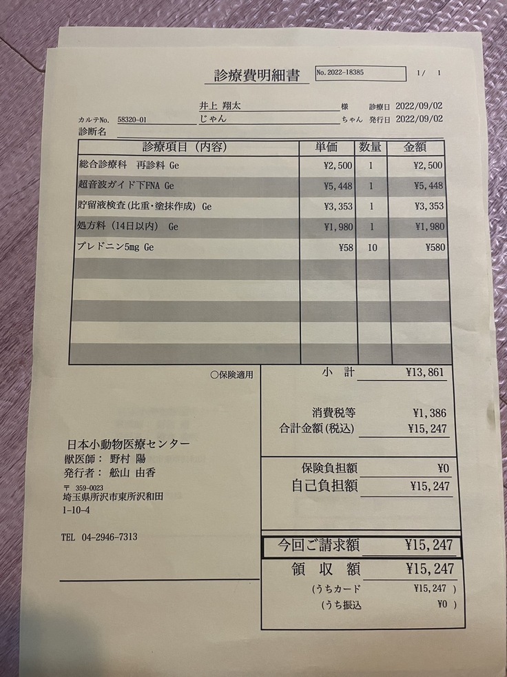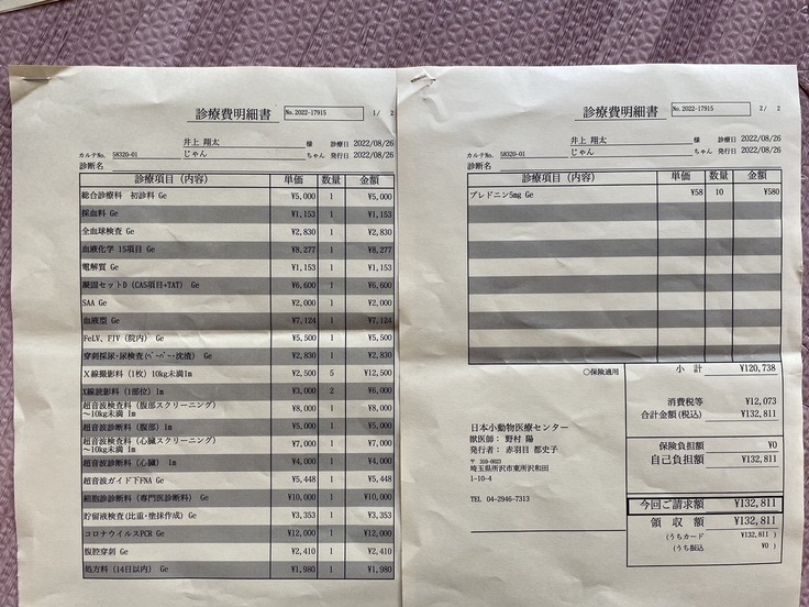 ↓その時にかかった検査費用 8月26日 (動物病院から掲載許諾を得ています)