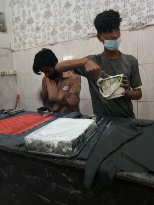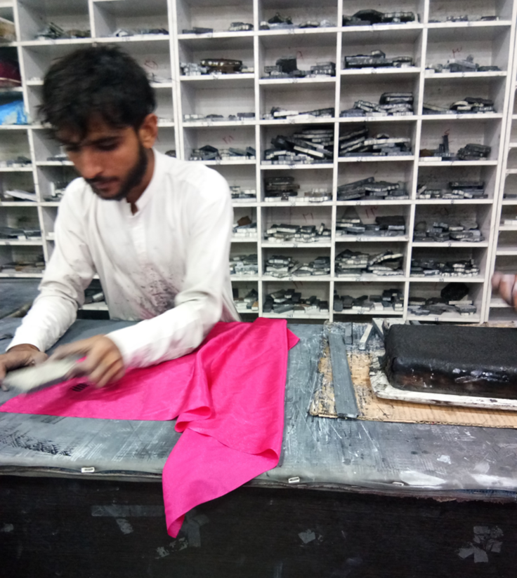 生地屋さんで選んだ生地をもって、インクを押し付けてくれる工房へ