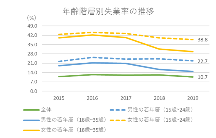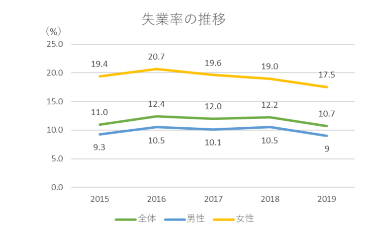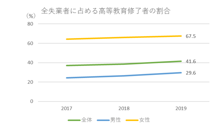 イラン統計センター(SCI)の発表によると、女性の失業率は男性より高く、特に女性の若年層(15歳~24歳)は、過去5年間を見ても高水準で推移しており、2019年度は38.8%でした。また、全失業者に占める高等教育修了者の割合は高いですが、中でも女性は67.5%であり、全体、男性と比較しても高い割合となっています。