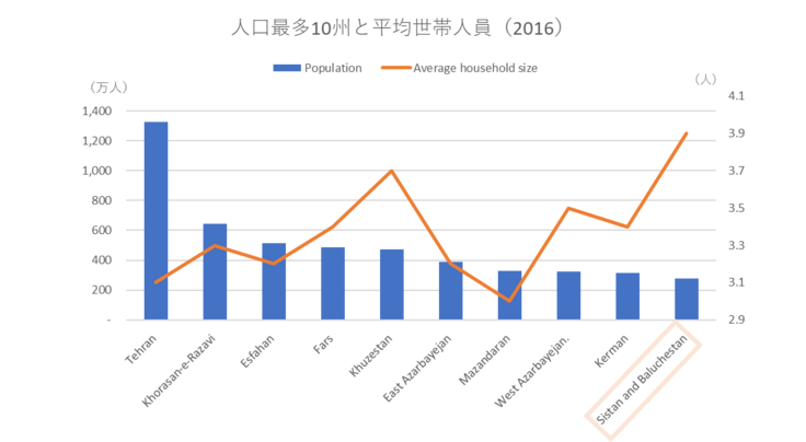 そんなイラン人にとっても遠い場所である「シスタン・バルチスタン州」は、イラン31州の中で、人口は10番目に多く、他の州と比べ1世帯あたりの人数も多いのが特徴です。