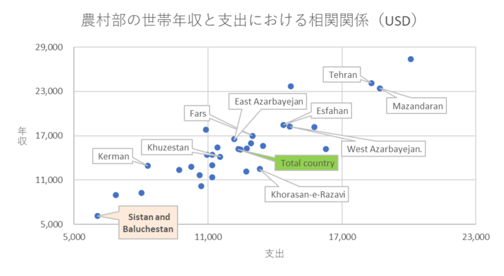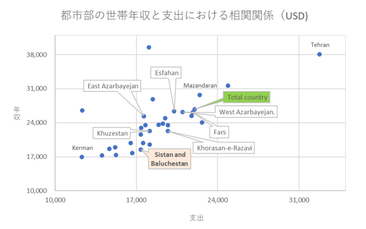 また、都市部と農村部の世帯年収と支出における相関関係を調べてみますと、31州の中では低い位置にあることが分かりました。