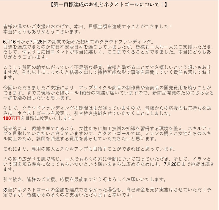 この美しくて華やかな刺繍を通して、女性たちと一緒に何かできないかと考え、ずっと思いを温めてきましたが、何も行動に移さなければ、思っているだけでは何も変わりません。そこで今回クラウドファンディングに挑戦して、より多くの方々に刺繍を知っていただき、皆様からの声を今後の商品開発に活かしていきたいと思っております。