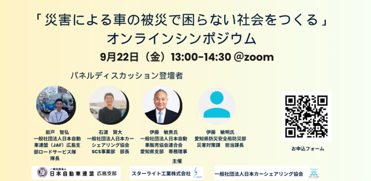 9/22(金)、13:00-、自然災害による車の被災という社会課題に向き合う一般社団法人日本カーシェアリング協会、一般社団法人日本自動車連盟(JAF)、スターライト工業株式会社が主催するオンラインシンポジウムを開催します。