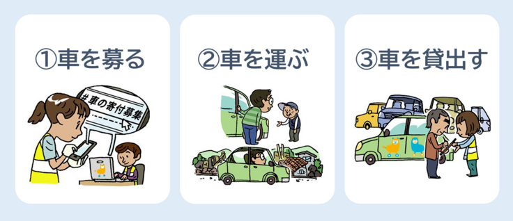 私たちは2011年の東日本大震災をきっかけに設立した非営利団体で、災害時に皆様から寄贈いただいた車を、被災者及び支援団体へ一定期間、無料で貸し出す支援活動を行っています。