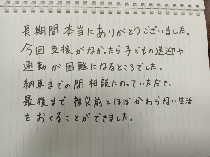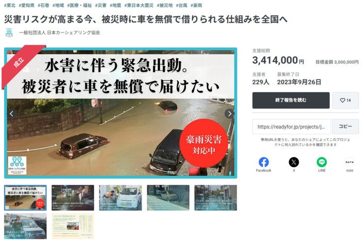 今回のクラウドファンディングを通じて大規模災害で車を失い、移動で困難を抱えることの影響の大きさと被災された方々への支援の必要性を一人でも多くの方に知っていただき、支援の輪が広がることを心から願っております。