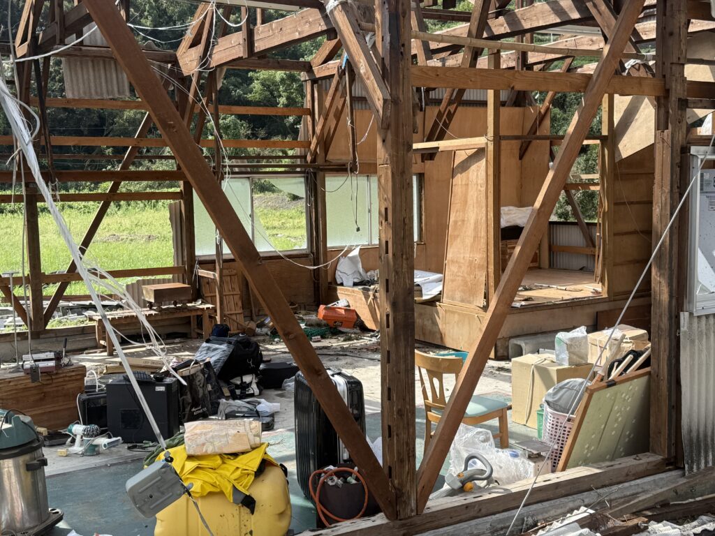 損壊部分は濡れており竜巻発生時にも線状降水帯による大雨や雷が同時に発生していたと思われ被災者の方々は相当怖い思いをしただろうなと感じました。また電柱が各所で倒壊し電気も使用できない事から照明・炊事・冷蔵庫の食品・風呂など通常の生活がまったくできず困難な状況下にあると痛感しました。道路では信号機が動かない事から交差点ではお互いに止まり様子を見ながら走る状況でした。