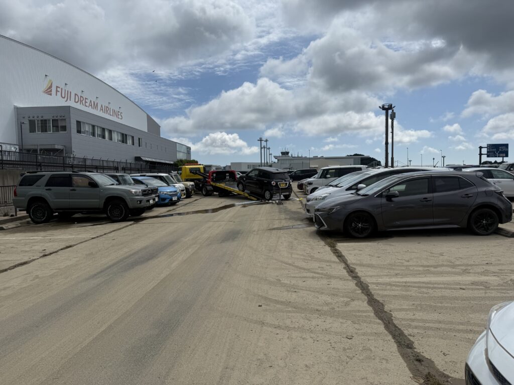ニュースによればこの第5駐車場は満車で500台ですが、かなりの台数が水没したとの事でJAFに100件以上の救援要請が入ったとの事です。富士山静岡空港株式会社様に状況確認と支援が必要かどうかのヒアリングを申し入れましたが、現在被害調査中との事でお話を聞けませんでした。既に多くの車がレッカーで移動された様子で、到着時も2台積み込み中でした。ただ、停まっている車両を見ると様々な地域のナンバーだったので、被災された方々は、一概にこの地域にお住いの方々ではない状況が確認できました。