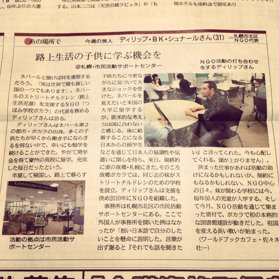 昨年の9月30日北海道新聞(夕刊)の記事になりますが、札幌市市民活動サポートセンターとNGOつぼみ学校ポカラとの繫がりが少し書かれています。