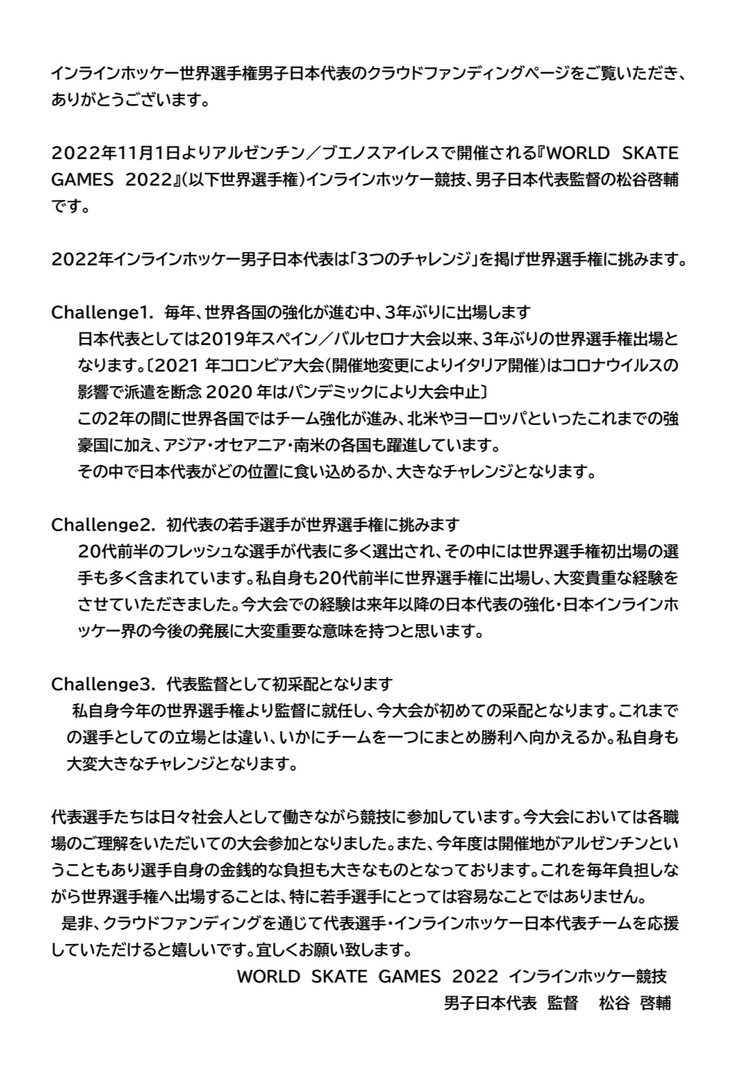 皆さまにはこのプロジェクトを通じ、インラインホッケーというスポーツを知って頂くと共に、皆さまのお力添えと、インラインホッケー日本代表チームの応援をして頂きたく、このプロジェクトを立ち上げました。
