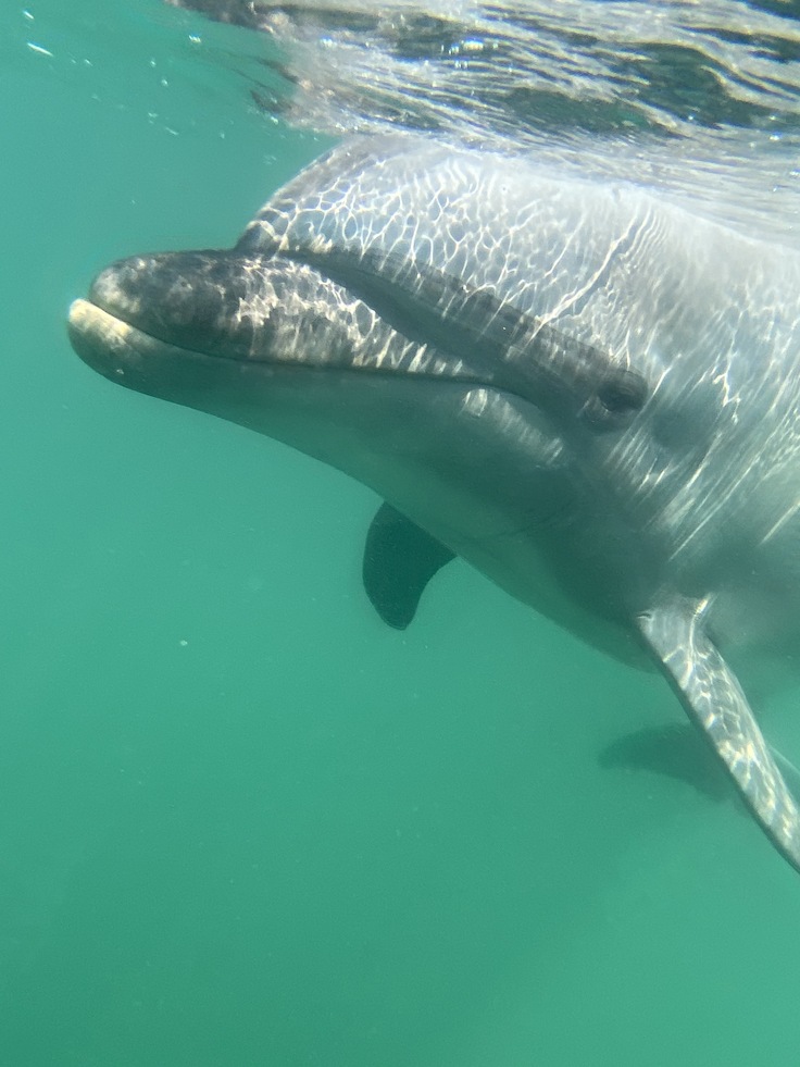ゴーグルやシュノーケルを使って顔を水につけるとイルカと目があったり、ピーピー音が聞こえてきたりします。