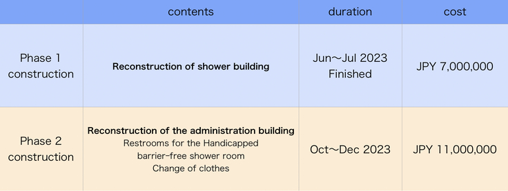 With your support, we plan to construct a shower changing room and restroom with a wide frontage and barrier-free access for people with disabilities and wheelchair users, as well as a nursing and diaper changing room for people with children, which was not previously available in the administration building.