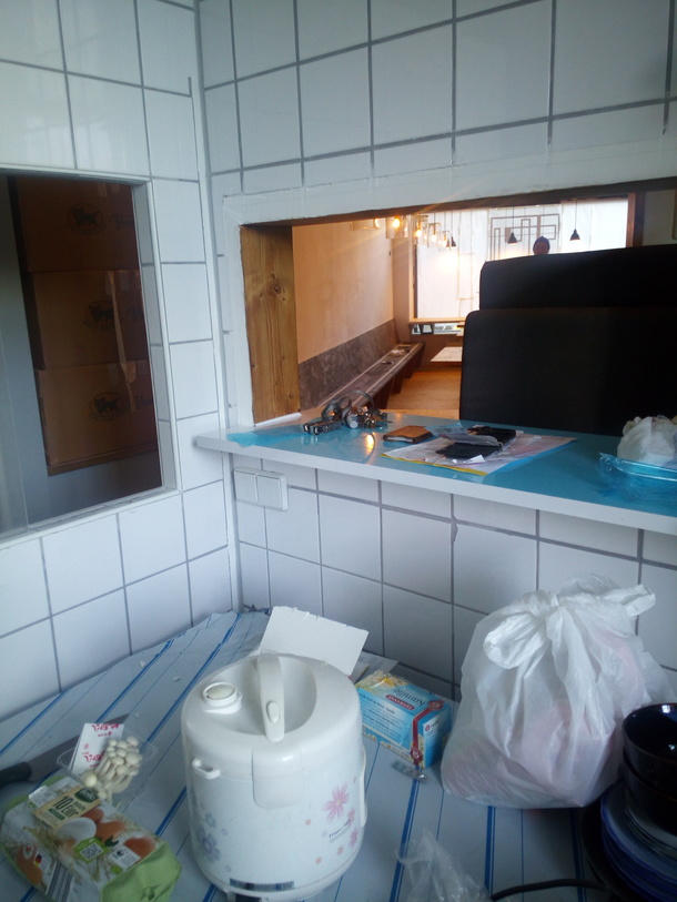 タイル貼りはキッチンの壁をぐるっと一周、寿司場の壁、トイレの壁、バーの壁など多くの箇所を貼りました。