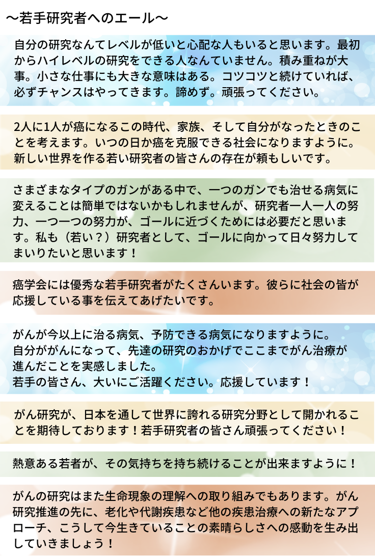 Twitterに多くのメッセージをお寄せくださり、実行委員一同、心より感謝申し上げます。「がん研究に期待すること」「若手研究者へのエール」というお題に対して、このページには掲載しきれないほどのメッセージを頂きました。一部になってしまいますが、以下ご紹介させてください!