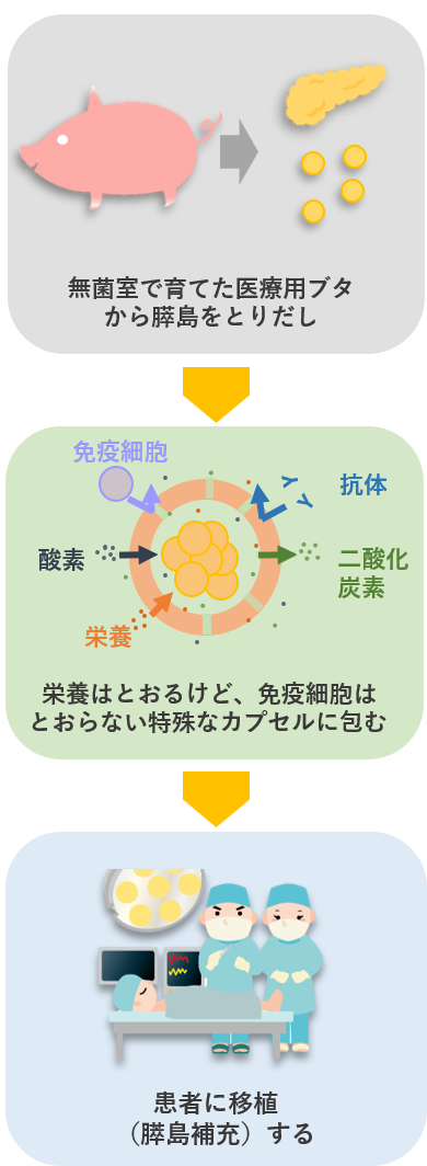本プロジェクトは新しい技術であるブタ膵島を用いた「バイオ人工膵島」の臨床応用を目指したものです。