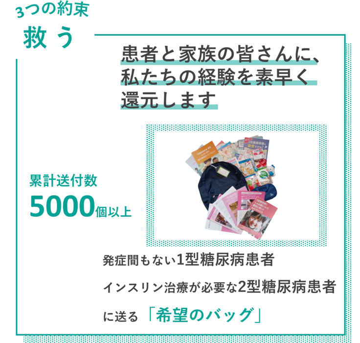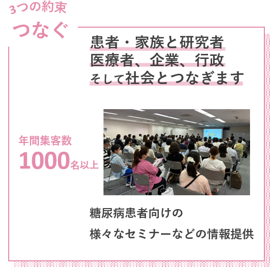 私たちは「1型糖尿病」の根絶(=治療+根治+予防)を目指して活動する患者・家族の支援団体です。 インスリン補充が必須な患者・家族が希望を持って生きられる社会を実現するのが私たちのミッションであり、情報提供や相談対応等の「救う」活動、災害時対応やセミナー開催等で患者・家族を他のステークホルダーと「つなぐ」活動、そして、寄付を募り日本の研究者に研究助成を行う「解決する」活動を「3つの約束」として活動に取り組んでいます。