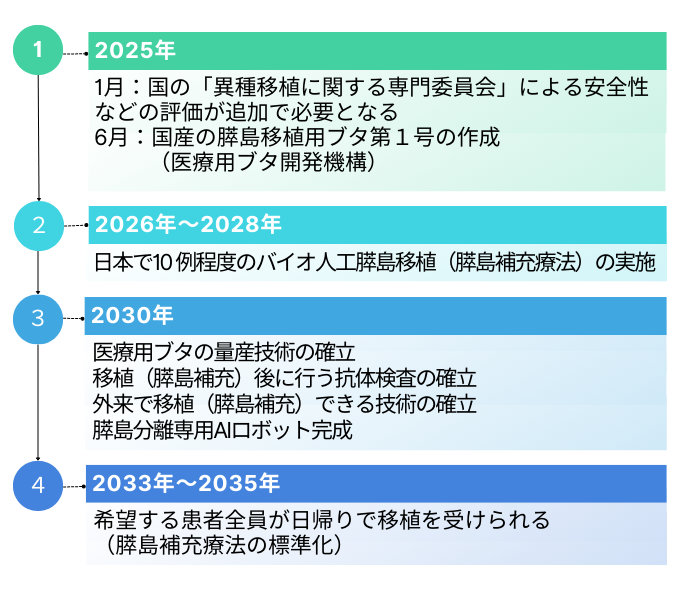 そしてついに、治験や製品化を見据えた研究が進められるようになったため、2025年の治験、2035年に希望する患者全員が日帰りで移植を受けられるよう「バイオ人工膵島移植ジャパンプロトコール2025基金」を2021年10月に創設し、重点的に研究支援を行っています。