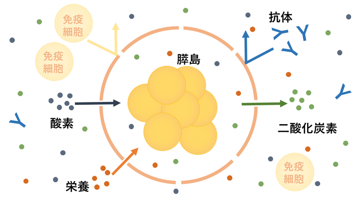 このカプセルにはとても小さな穴が開いており、栄養や酸素等の小さな物質は通ることができますが、免疫細胞や抗体(どちらも自分の細胞以外の異物を排除する働きをもつ)のような大きなものは通ることができません。