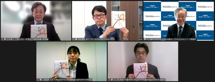 それぞれの研究の代表者である、医療用ブタ開発機構 松本慎一代表理事、神戸大学 浅利貞毅特命教授、摂南大学 井上亮教授、日本大学 小須田南助教にご出席いただき、日本IDDMネットワークからは理事長の井上龍夫が出席いたしました。