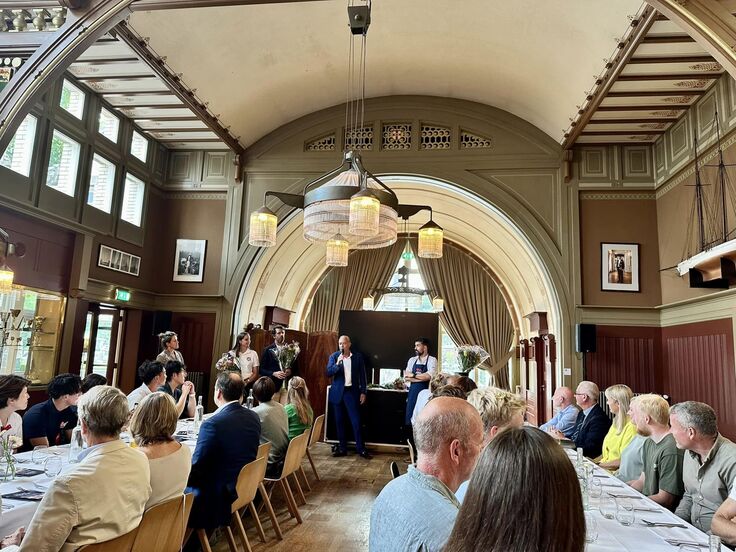 コースタルローイングならではの文化として、大会前に「Welcome Party」が盛大に開催され、そこで選手やコーチ同士で交流を図ります。この日はオランダ内でも格式が最も高いとされる「Koninklijke Roei- en Zeilvereeniging De Maas」のクラブハウス内で懇親会が行われました。