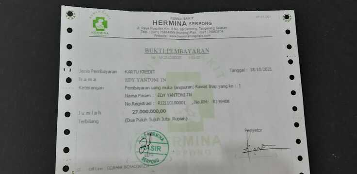 腫瘍の摘出手術を受けた病院の手術前デポジットの領収証 Rp.27,000,000(約216,00円)
