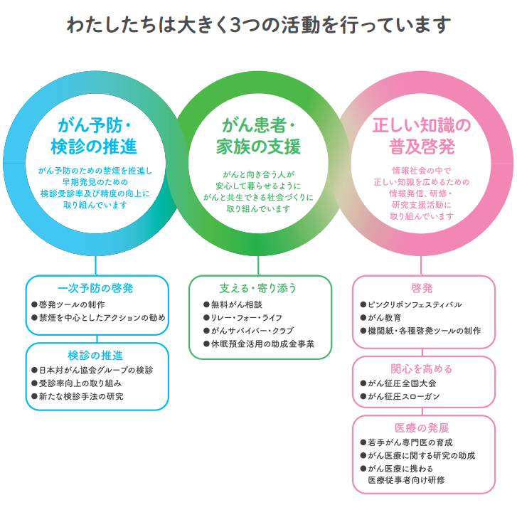 「がんで苦しむ人、悲しむ人をなくす」をスローガンとして、三つの重点活動をしています。一つ目は「がん予防・がん検診の推進」です。がん予防では特に禁煙推進に力を入れ、がん検診では毎年、全国支部のうち42支部で延べ約1100万人以上に検診をしています。 検診受診率向上にも力を入れています。二つ目は「がん患者・家族の支援」です。患者支援の「リレー・フォー・ライフ」という活動を全国約50カ所で開催、がん無料相談、患者支援の「がんサバイバー・クラブ」を運営しています。三つ目は「がんの正しい知識の普及啓発」です。乳がんの啓発「ピンクリボンフェスティバル」の開催や、子どもに対する「がん教育」を実施しています。