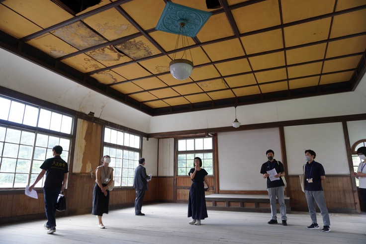 内見会に参加したのは、建物を所有していたJAしまね、地区の住民の皆さん、美又地区のまちづくりセンター、浜田市金城支所、島根県の職員の方々、金城町内の3郵便局長、日本海信用金庫旭町支店長、近くにある美又温泉の旅館経営者、建物の改修を担当する工務店の関係者など、暑い中でしたが40人もの方々が集まってくださいました。